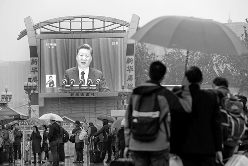 10月18日,北京火車(chē)站站前廣場(chǎng)大屏幕播放中國(guó)共產(chǎn)黨第十九次全國(guó)代表大會(huì)開(kāi)幕會(huì)直播,民眾在雨中駐足觀看。杜 洋 攝