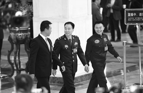 10月18日,中國(guó)共產(chǎn)黨第十九次全國(guó)代表大會(huì)在北京人民大會(huì)堂開(kāi)幕。開(kāi)幕前舉行首次“黨代表通道”采訪活動(dòng)。圖為景海鵬(中)、唐嘉陵(右)、趙宏博代表接受采訪。 毛建軍 攝