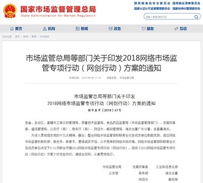 2018網(wǎng)絡(luò)市場監(jiān)管專項行動(網(wǎng)劍行動)方案