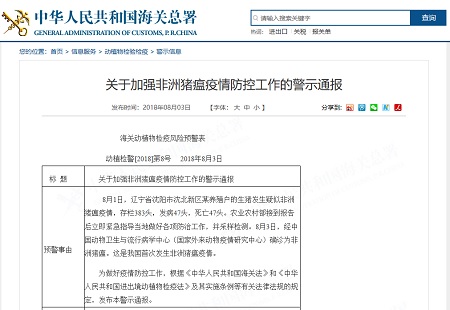 海關(guān)總署發(fā)布《關(guān)于加強(qiáng)非洲豬瘟疫情防控工作的警示通報(bào)》